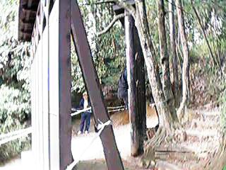 24:杭の切れ込みに手と足をかけて、伝って行きます。