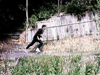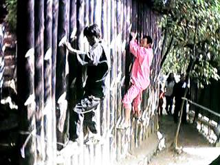 22:壁づたい。左側の塀を落ちないように伝ったあと、中央の杭が並んだ塀をロッククライミングのように伝っていきます。