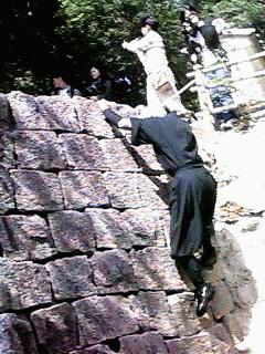 26:石垣をよじ登っている忍者。ここは駆け上がらなきゃダメ。